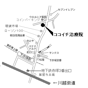東京メトロ(地下鉄)有楽町線副都心線、地下鉄赤塚駅3番出口を出て、左手の信号を左折、踏切を渡り直進し100円ローソン、眼鏡市場の先。所要時間は5〜6分です。